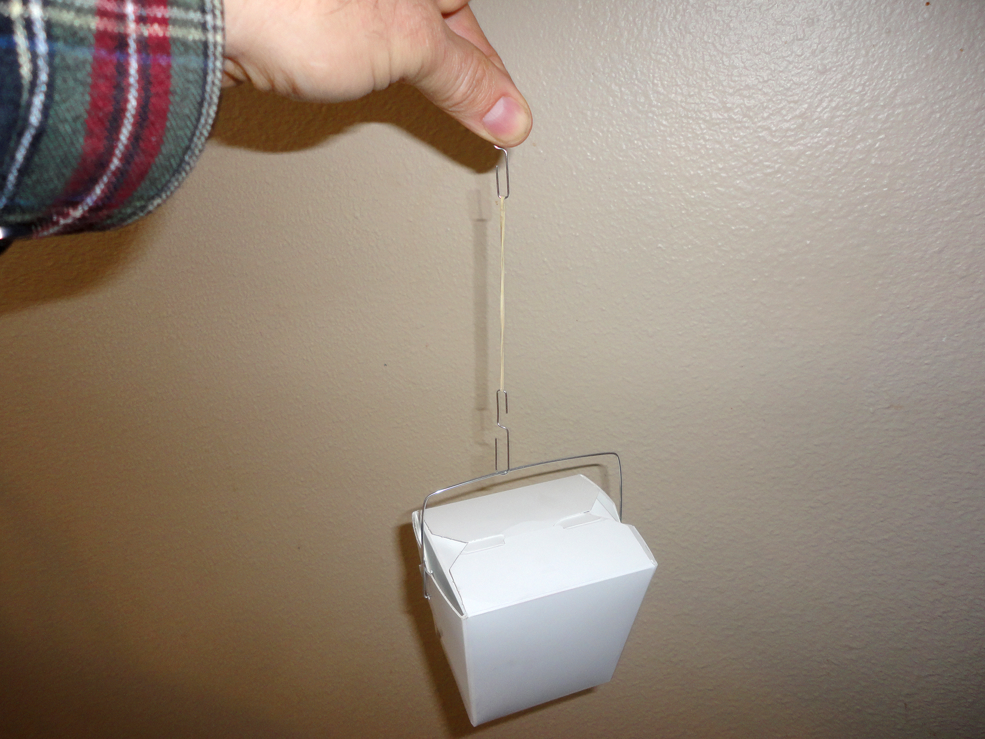 Hang your small object to get the force needed to pull it straight up. Measure this distance and record it. To see this is the force needed to pull the object straight up, put the object on the floor beside the chair and lift it straight up. See how the rubber band pulls the same distance?