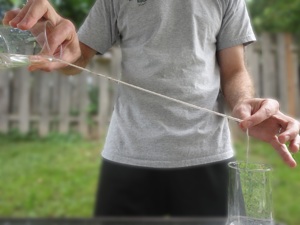 - Pour the water slowly along the string… watch as it clings to the string and drips off the end into the empty cup! (Be prepared to clean up a little as spilling is bound to happen…)