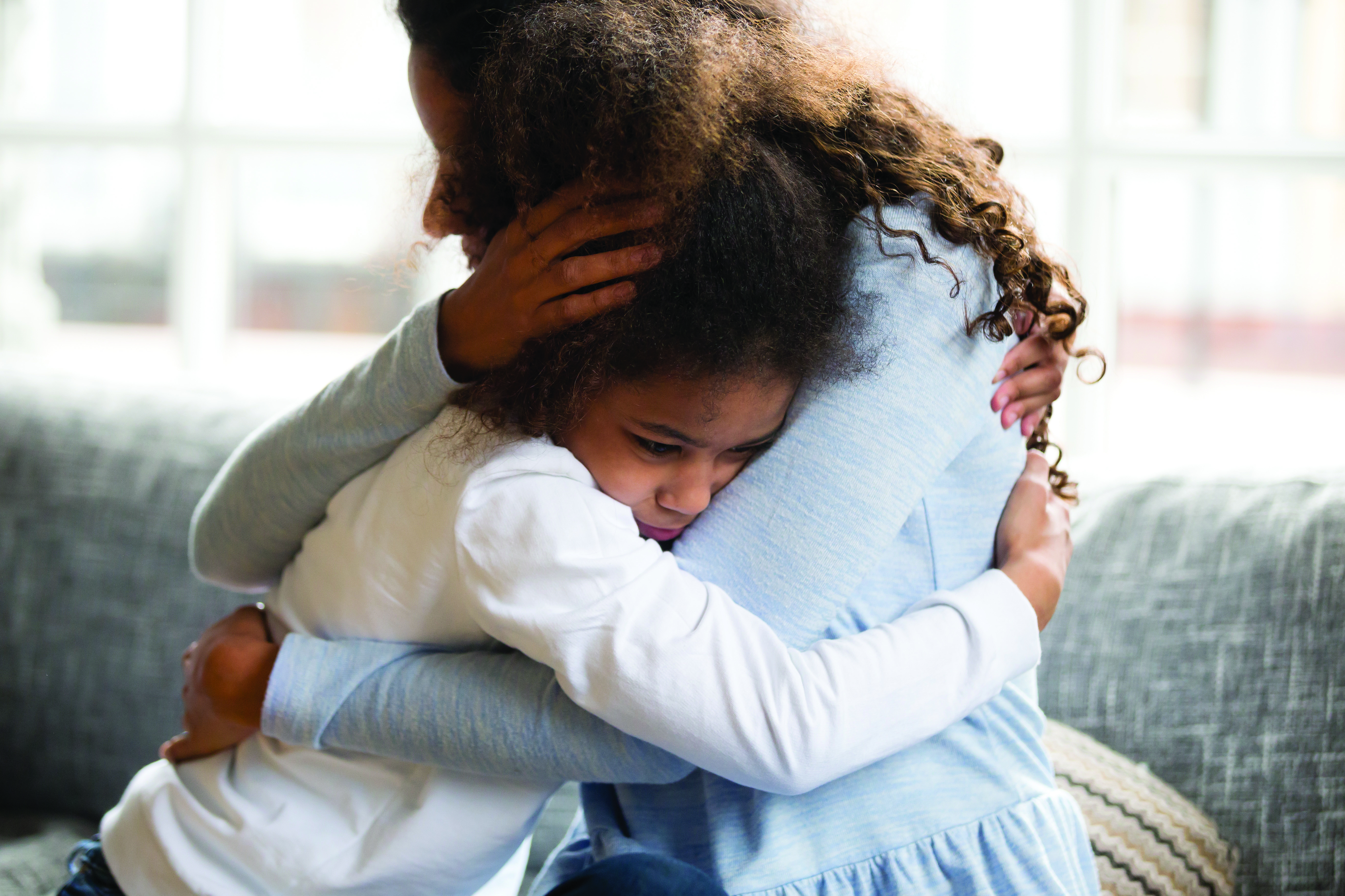 Black African mother embrace little preschool frustrated kid sitting on couch together at home. American loving mother supports disappointed daughter sympathizing, making peace after scolding concept
