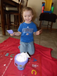 I got out the sand buckets, filled up one for each kid and let them have a blast! We had fun and learned all at the same time! Sure it was very simple stuff like the snow is soft and powdery until it is packed into a ball and then it is hard and can hurt if you catch a snow ball to the face, that it melts when you hold it in your hand very long and as the baby learned it is cold if you eat it! The point is that it was fun. It was a change of pace. It was something we don’t get to do very often, and we didn’t let the crazy weather or getting over being sick ruin our fun!