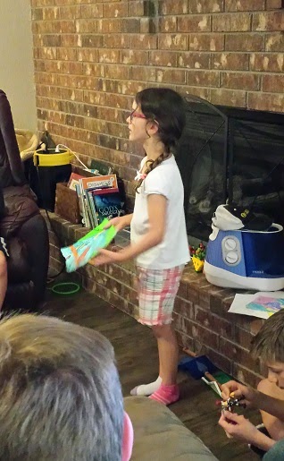 What kinds of subjects will you cover? Are you wanting to cover traditional academic subjects like math and literature, or do you want to have enrichment classes? Our group has 18 kids ranging in age from 5 to 13, so we decided that enrichment activities would make the most sense. We cover hymn study, picture study, artist and/or composer study, Spanish, Shakespeare, science experiments, and art techniques. We also end each session with a show and tell time based around a specific theme. (The picture here is of my daughter telling the group about a drawing she made.)