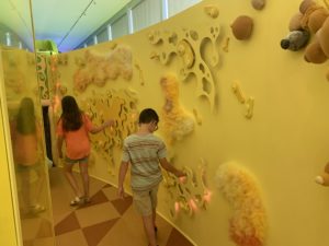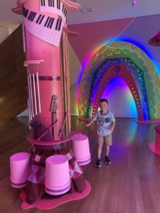 Each section of Synesthesia represents a different color, and each is perfectly unique. My kids’ favorite part was the fuchsiaworld, where they played pink “drums” made out of buckets. I could tell that making unabashed noise in an art museum felt both rebellious and exciting to them (and the same may have been true of the adults!)
