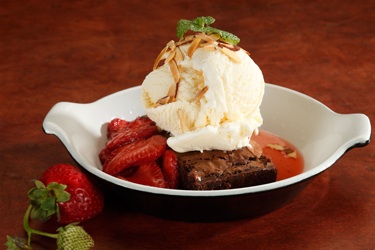 - To compile the sundaes, place a fudge brownie in shallow bowl or on plate. Top the brownie with a scoop of vanilla ice cream. Spoon the warm strawberry sauce on top of the sundae. Bon appétit!