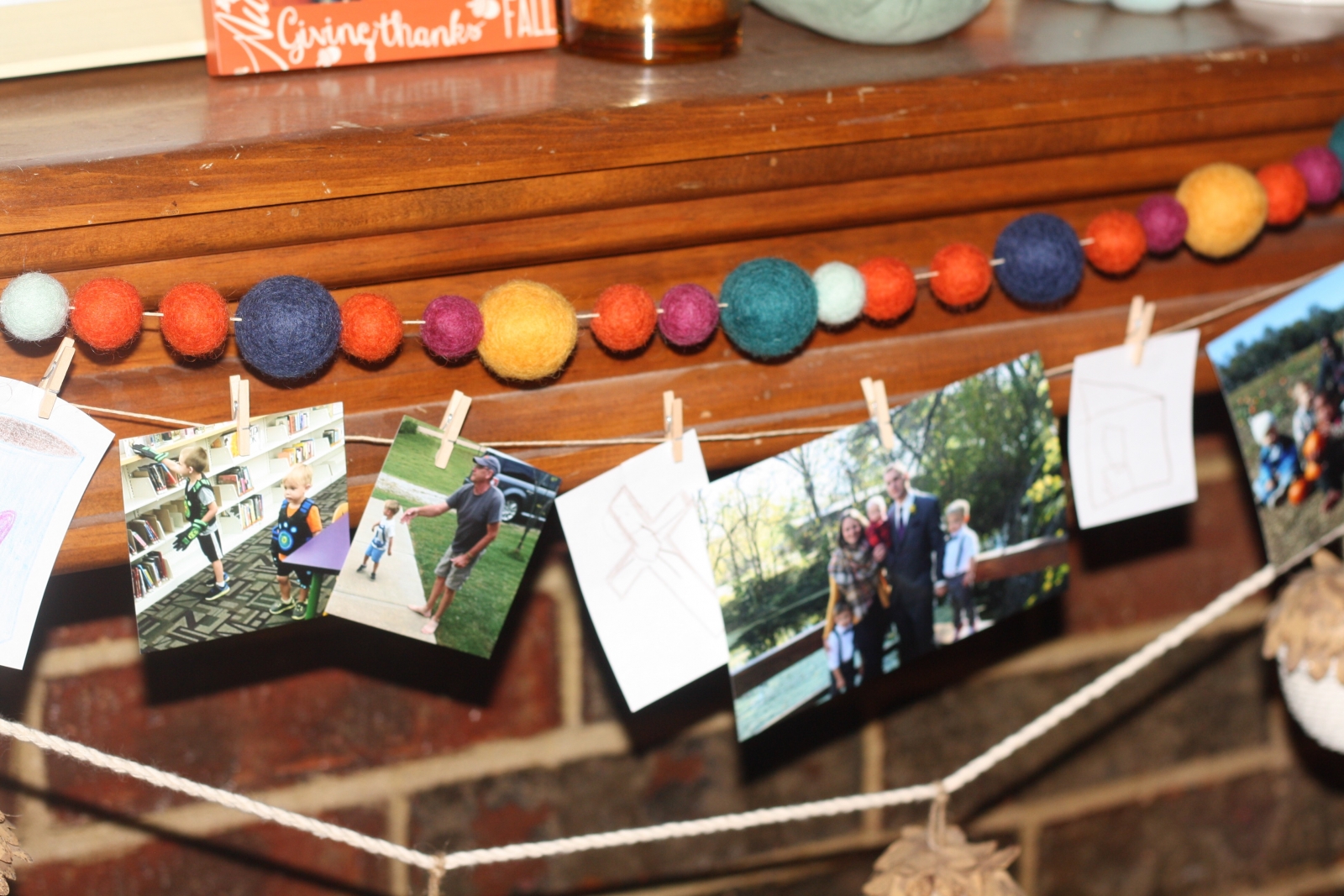 We started by sitting down as a family and brainstorming a list of things that we are thankful for. We divided the list up into people, places and things to help us think of a variety of items, big and small. Then we decided which items to include in our garland. For some items, we found or took photos and for others, we hand drew pictures. You could even cut pictures out of magazines. Then use paperclips or yarn and a hole punch to attach the pictures to the garland. I love the visual reminder of all our blessings and the combination of the drawings and photographs. You can get fancy and add letters to spell out thankful or blessings.
