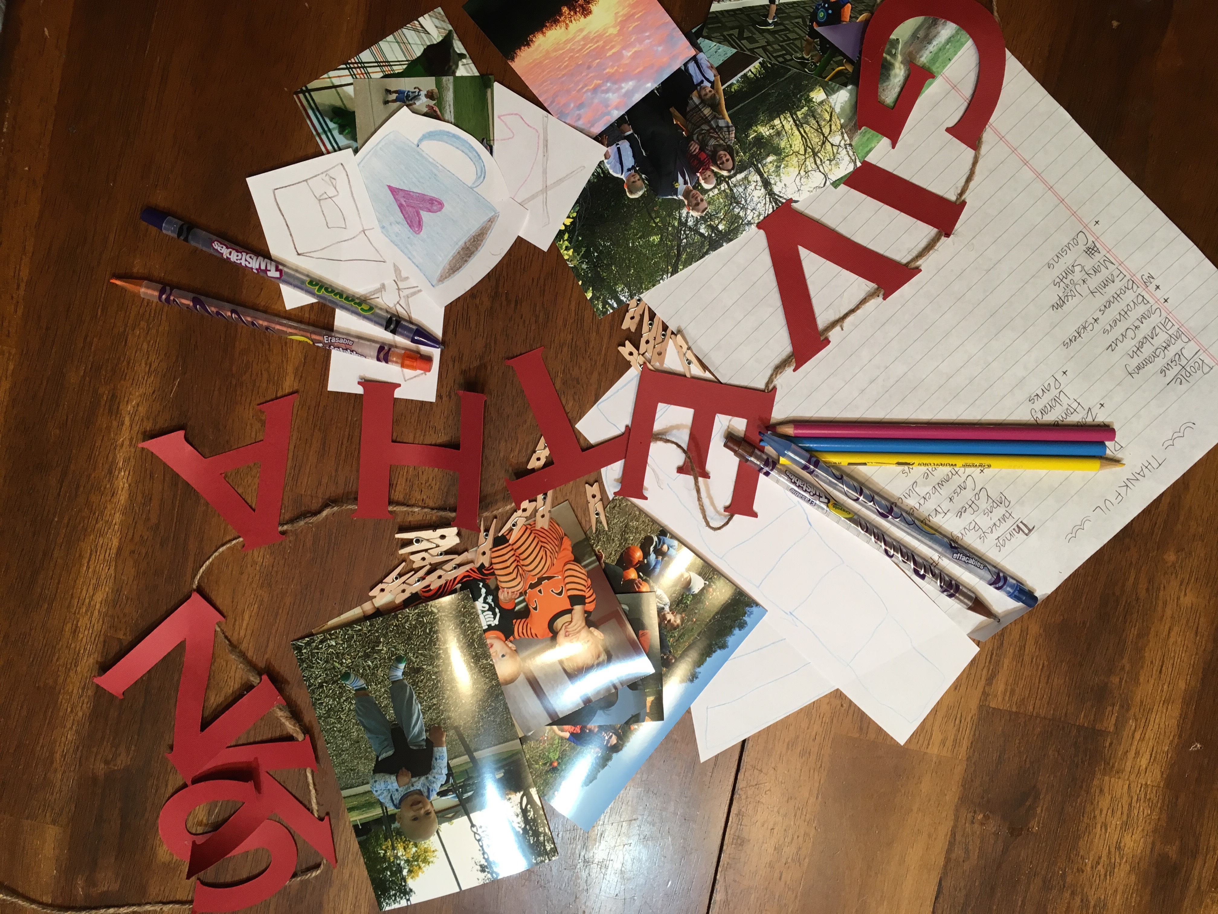 We started by sitting down as a family and brainstorming a list of things that we are thankful for. We divided the list up into people, places and things to help us think of a variety of items, big and small. Then we decided which items to include in our garland. For some items, we found or took photos and for others, we hand drew pictures. You could even cut pictures out of magazines. Then use paperclips or yarn and a hole punch to attach the pictures to the garland. I love the visual reminder of all our blessings and the combination of the drawings and photographs. You can get fancy and add letters to spell out thankful or blessings.