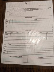 We start with a huddle, we recite our family mission statement, then go around and say what we love about each other. We cover activities each person has that week and what kind of support they’ll need. All of this happens on a large sheet my husband designed and laminated. We then move to meals for the week, then to
