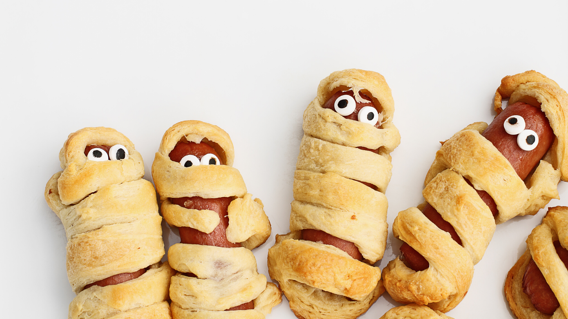 - Wrap 4 strips of dough around each hot dog to look like bandages, making sure to leave room at the top for the “face.”