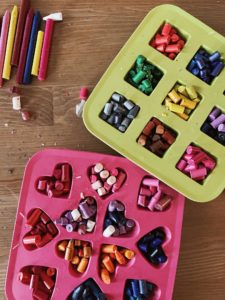 An oldie but a goodie, homemade crayons can provide a whole day of fun for little ones. The first thing you’ll need is a silicone mold in the shape of your choosing. Then, work together to unwrap the paper from lots of crayons. I have found a hobby knife to be very helpful in getting the wrappers off without much hassle. Next, break the unwrapped crayons into ½” pieces and put them into the molds. You can mix colors, keep them