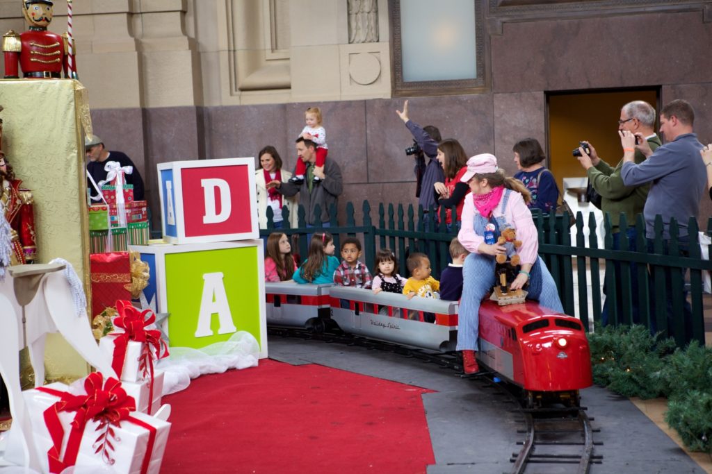 Visitors to Union Station can visit with Santa and his elves and tour the inside of three of the decorated cars. Cars in the train include a happy tank car named “Rudy,” a flatcar with Santa’s sleigh, reindeer and a tiny village, a ginger bread boxcar, the elves’ workshop, the reindeer stable and a little red caboose. Each car is decorated with colored lights. There is no charge to tour the train.