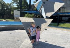 Two kids standing by the geometric sculpture, Finity, in front of Science Museum Oklahoma enjoying Oklahoma's STEM experiences.