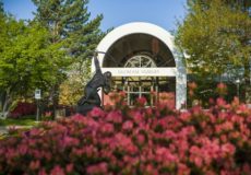 Two kids standing by the geometric sculpture, Finity, in front of Science Museum Oklahoma enjoying Oklahoma's STEM experiences.