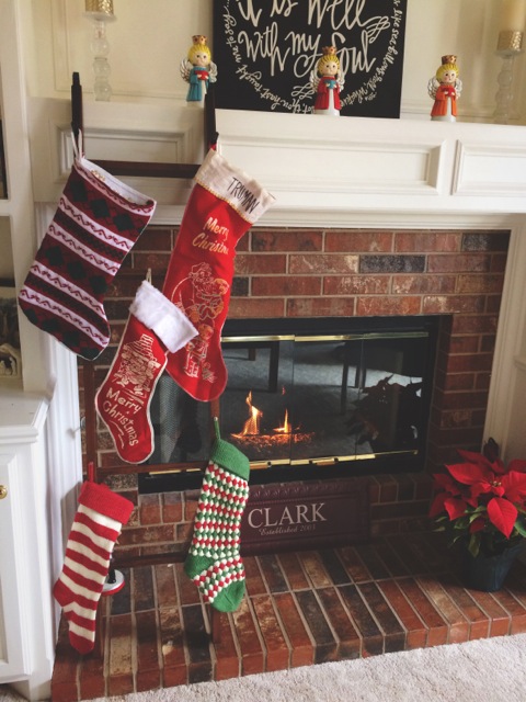 For those of you that may not have a fireplace hearth to hang your stockings on, or for those who would rather NOT dangle a bunch of fabric so close to an open source of flame, consider a wooden ladder! Ours is an old bunk bed ladder that was no longer being used. This option keeps your stockings portable and won’t put any holes in your mantelpiece. I love this option because we use our fireplace regularly. I didn’t want to have to move all the stockings every time I wanted to cozy up by the fire. Now I can just quickly move them off to the side, easy breezy!