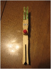 - Take one clothespin and add a dab of glue to the round part of the pin for the nose. Apply a red pom pom, red bead or draw it on with a red marker.