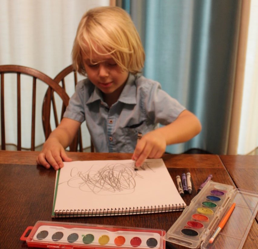 Let’s begin: Sit down with your sheet of white paper and your black crayon. Close your eyes. Start the music and simply listen to the beats and rhythm for a few seconds. With your eyes closed, move your crayon over your page to create dancing lines in response to the music. Open your eyes and check out the groovy lines your have drawn! Set up your watercolor tray and grab your paintbrush. Keep listening to music as you add color to your abstract composition. The wax crayon will resist the watercolor paint, creating a layered effect. What colors represent the mood of the music? Repeat the process. Start a new song with a different rhythm, style or beat. How do your dance drawings change with each new song?