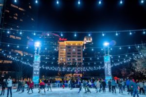 experiencing the magical atmosphere and glittering lights of the Devon Ice Rink at the Myriad Botanical Gardens.