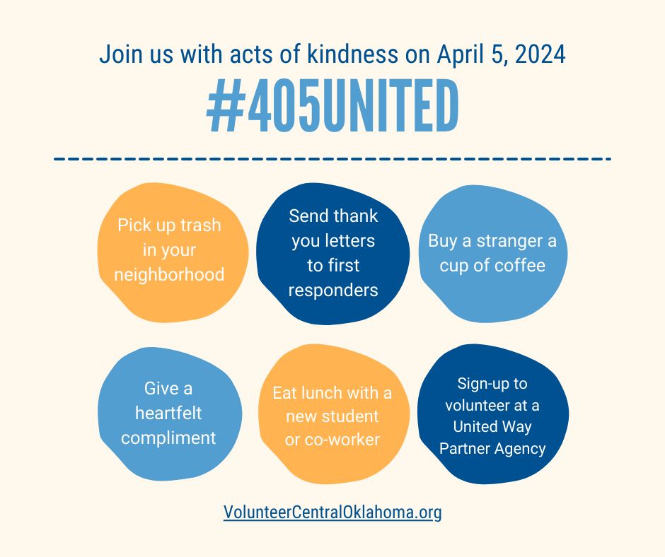 United Way of Central Oklahoma invites the public to join us as we give back to our community through acts of kindness. 405 Day is a one-day event on April 5 to bring the community together through “Acts of Kindness.” Complete an act of kindness on 405 Day, tag us and use #405United in your social media post.