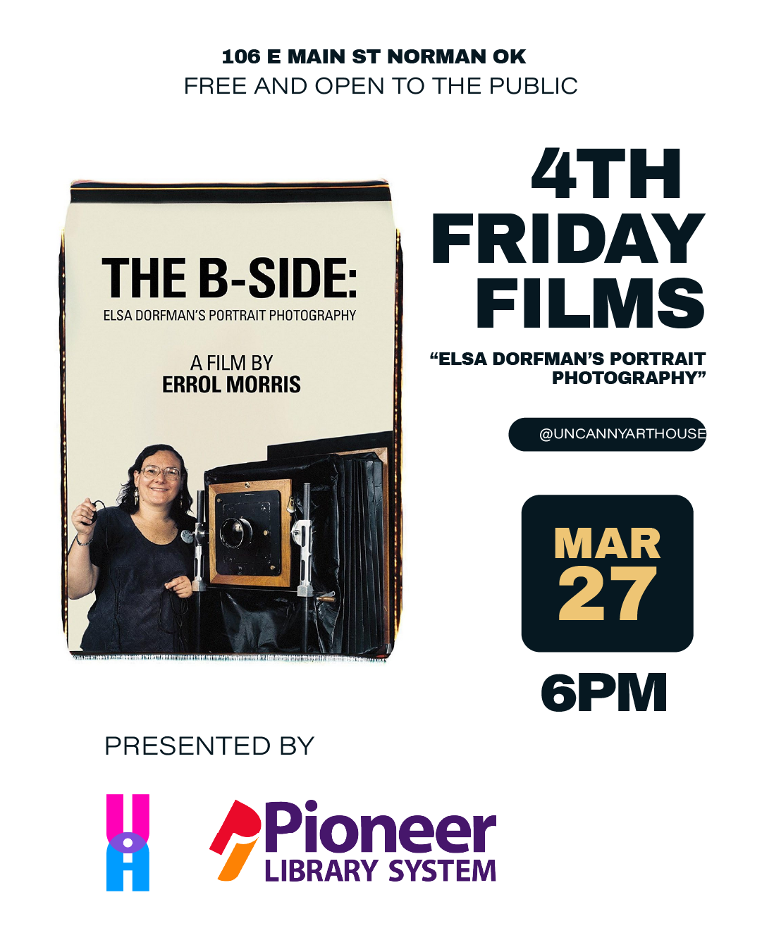 The March screening is of The B-Side: Elsa Dorfman’s Portrait Photography. This intimate documentary reflects on photographer Elsa Dorfman’s fifty-year career, offering insight into her large-format Polaroid portraits and the cultural figures she photographed.