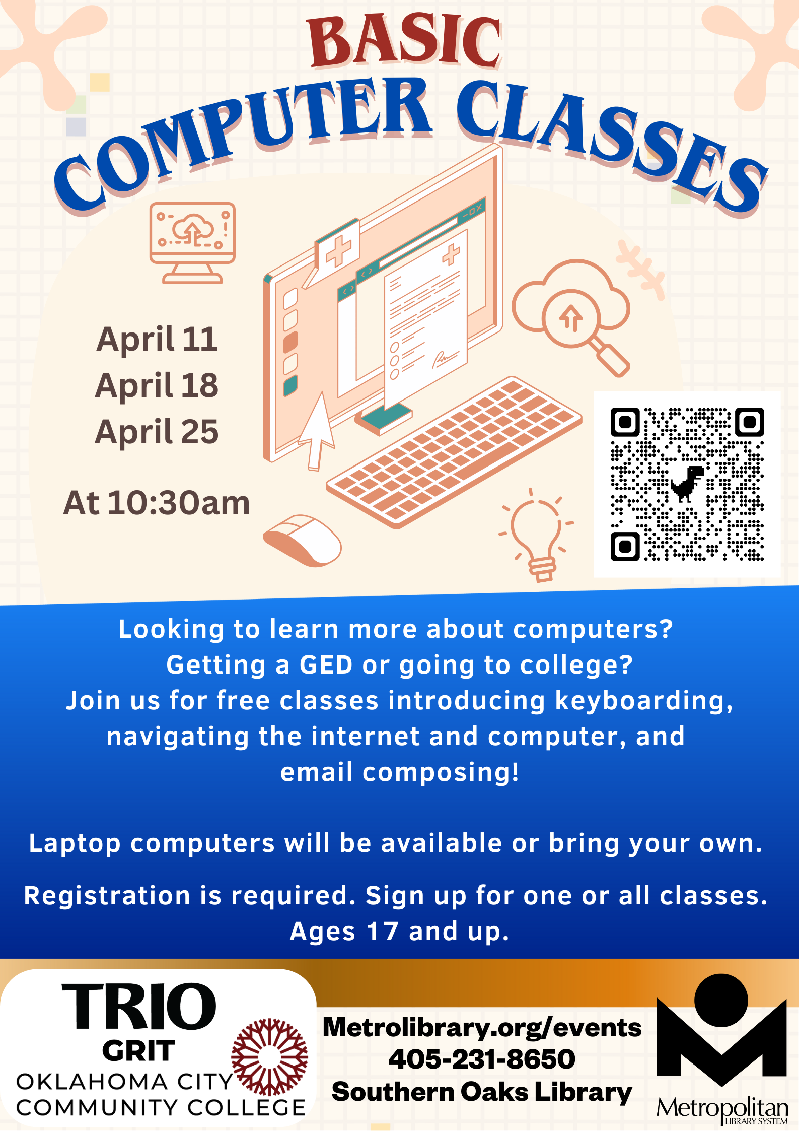 Features a free computer class led by a Oklahoma City Community College (OCCC) presenter from the TRIO Educational Opportunity Center (EOC) covering internet searching and email composing. These classes can help towards GED or college credits.