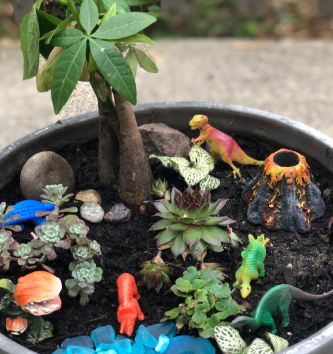 Create your own dino rock garden. Personalize with houseplants, dinosaur decor and new prehistoric friends.