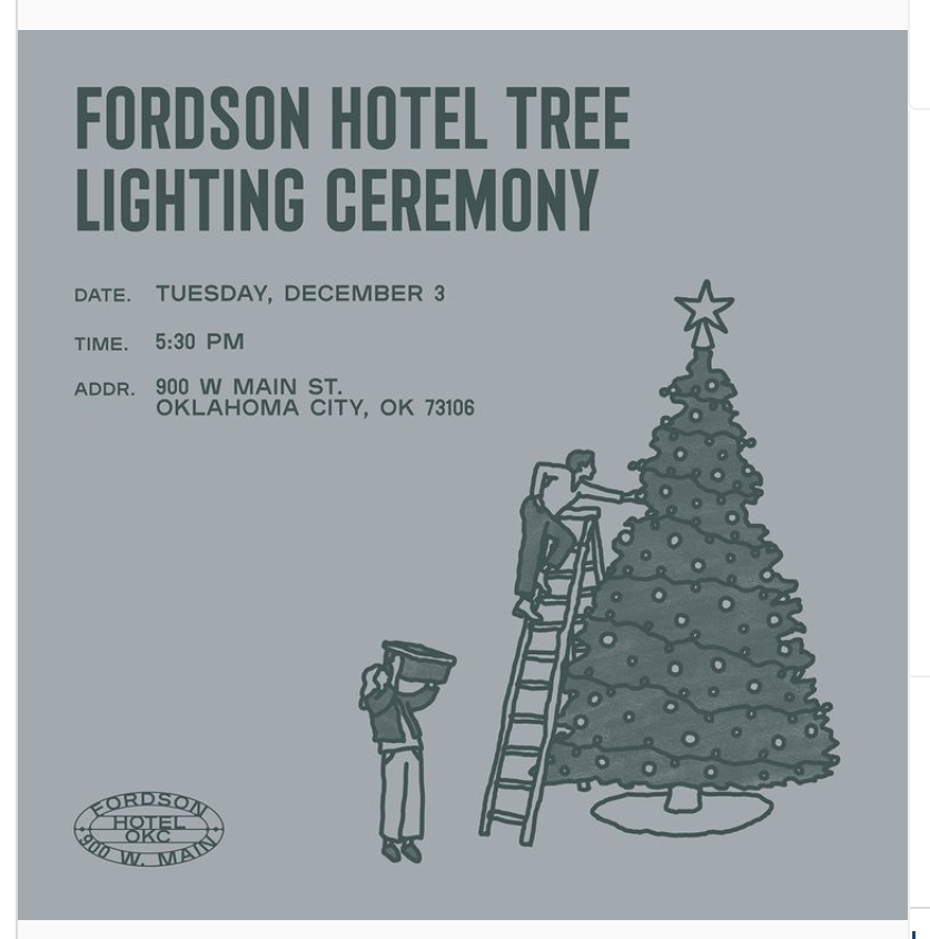 Fordson Hotel, an industrial revolution-inspired property nestled in Oklahoma City’s emerging West Village District, will host its inaugural tree lighting ceremony in the hotel lobby. Cocktails and canapés will be served, and Santa will be available for photos next to the hotel’s iconic Ford Model T. The Trevor Galvin jazz trio will be present to fill the air with festive holiday tunes.