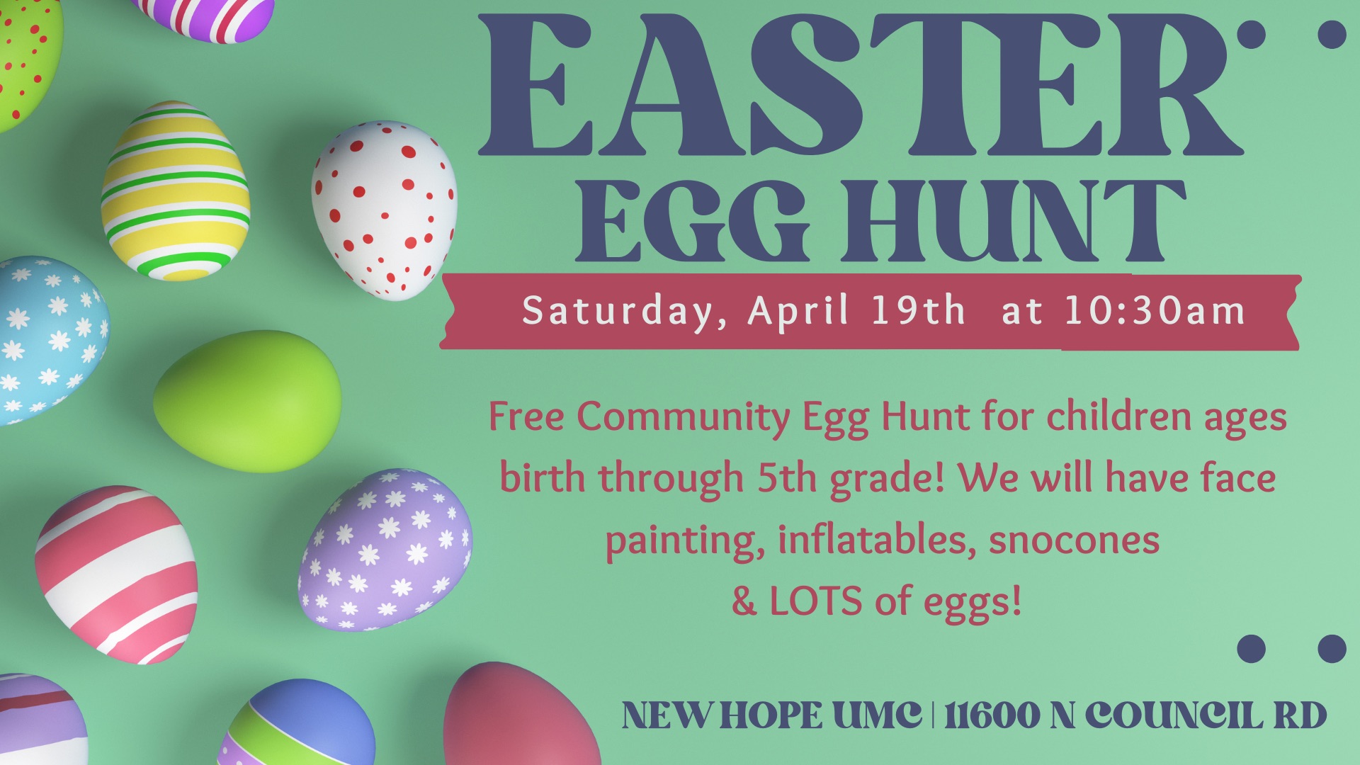 Features an Easter egg hunt, pictures with the Easter bunny, inflatables, face painting and free snow cones for the children.