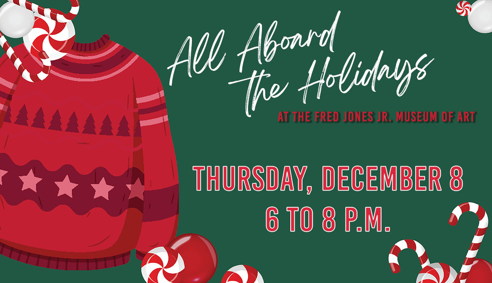 See Factory Obscura’s SYNESTHESIA experience at night, during the annual holiday celebration at the Fred Jones Jr Museum of Art. Opening night includes art activities, a cookie and hot cocoa bar, live music, door prizes, model trains, and pictures with Santa Claus.