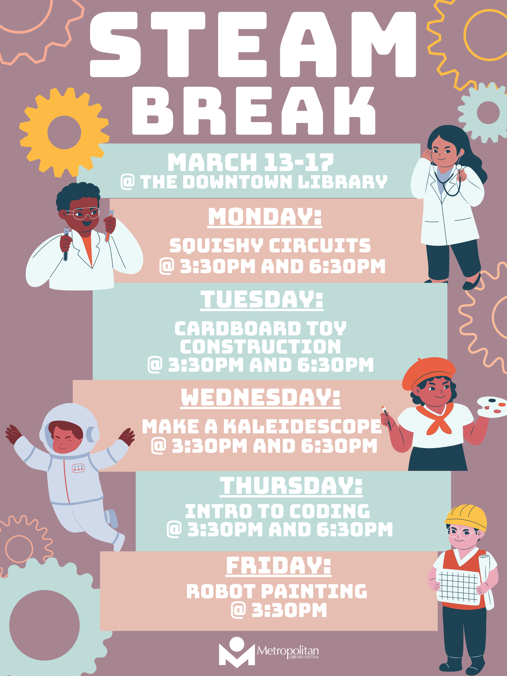 Features creative and engaging programs designed to introduce concepts and develop skills related to science, technology, engineering, art, and math.