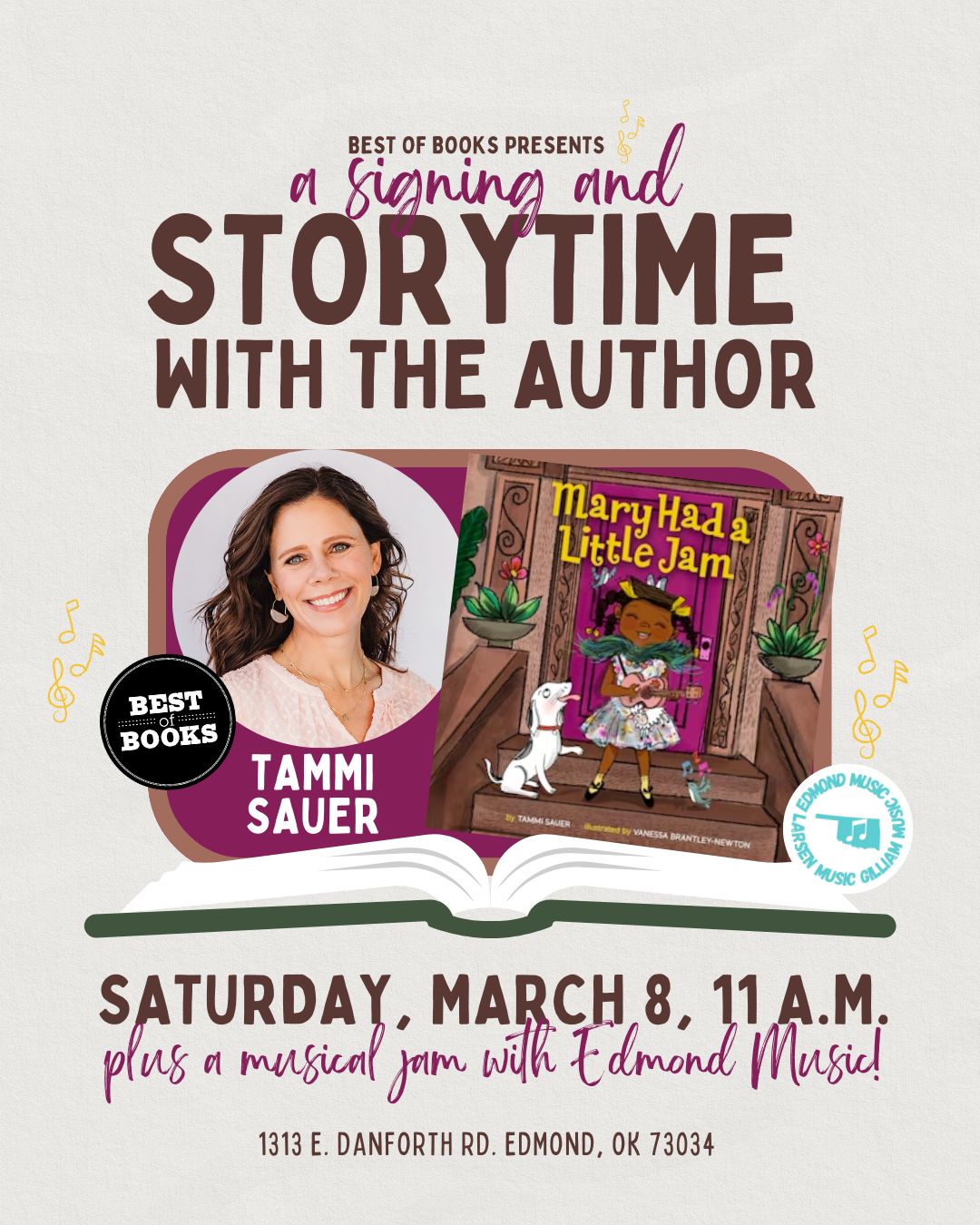 Oklahoma author Tammi Sauer will read her book "Mary Had a Little Jam." Sauer will sign her books afterward.