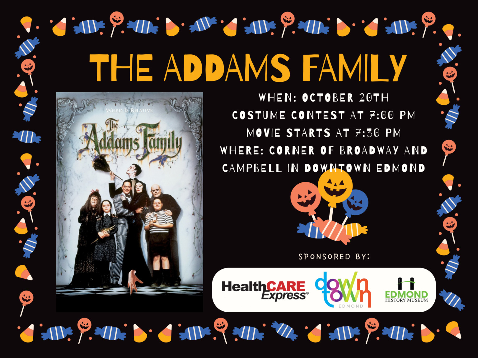 Features an outdoor screening of The Addams Family (1991) and a costume contest.