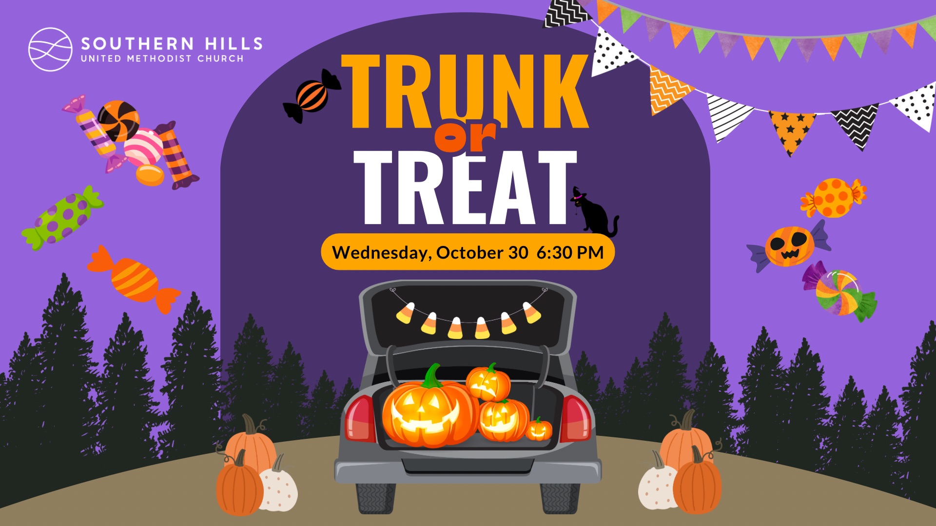 Features decorated trunks, candy, games, cake walk and a spooky house.