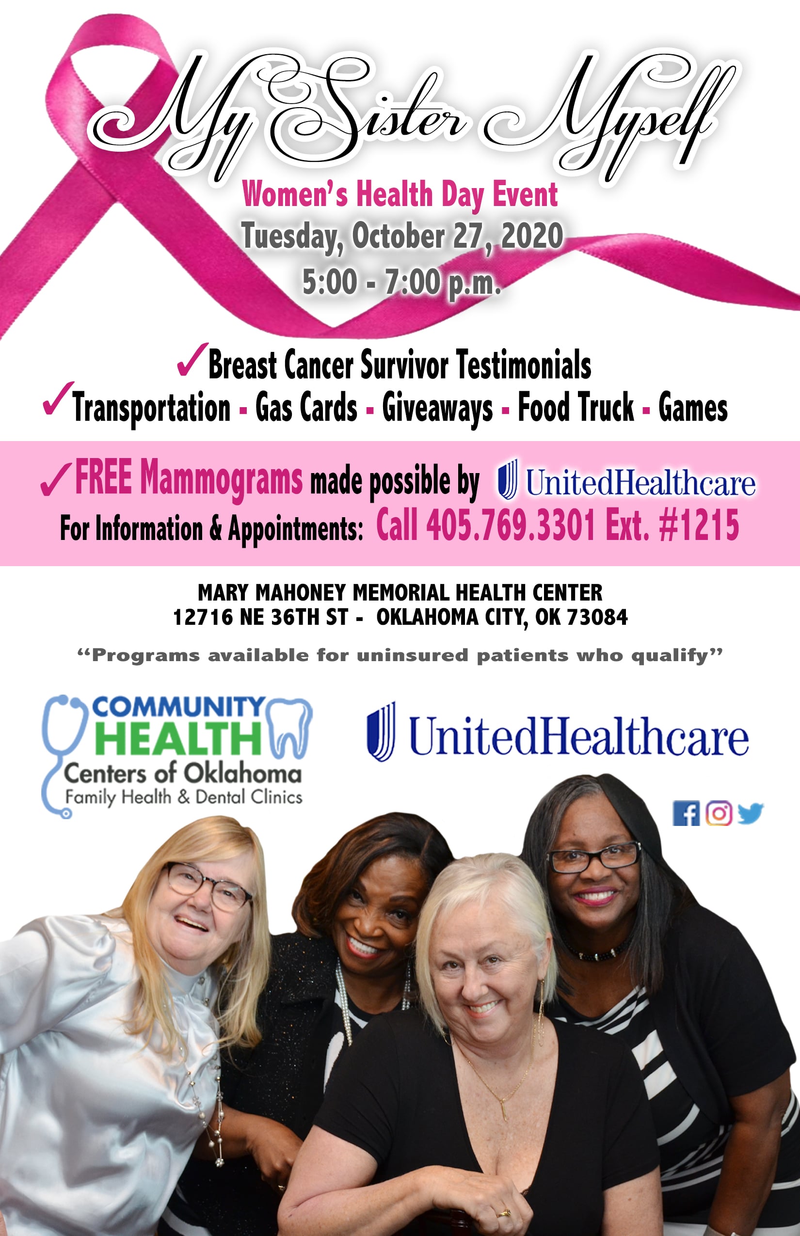 Features FREE mammograms, cancer survivor testimonials, giveaways, food trucks, games and more.