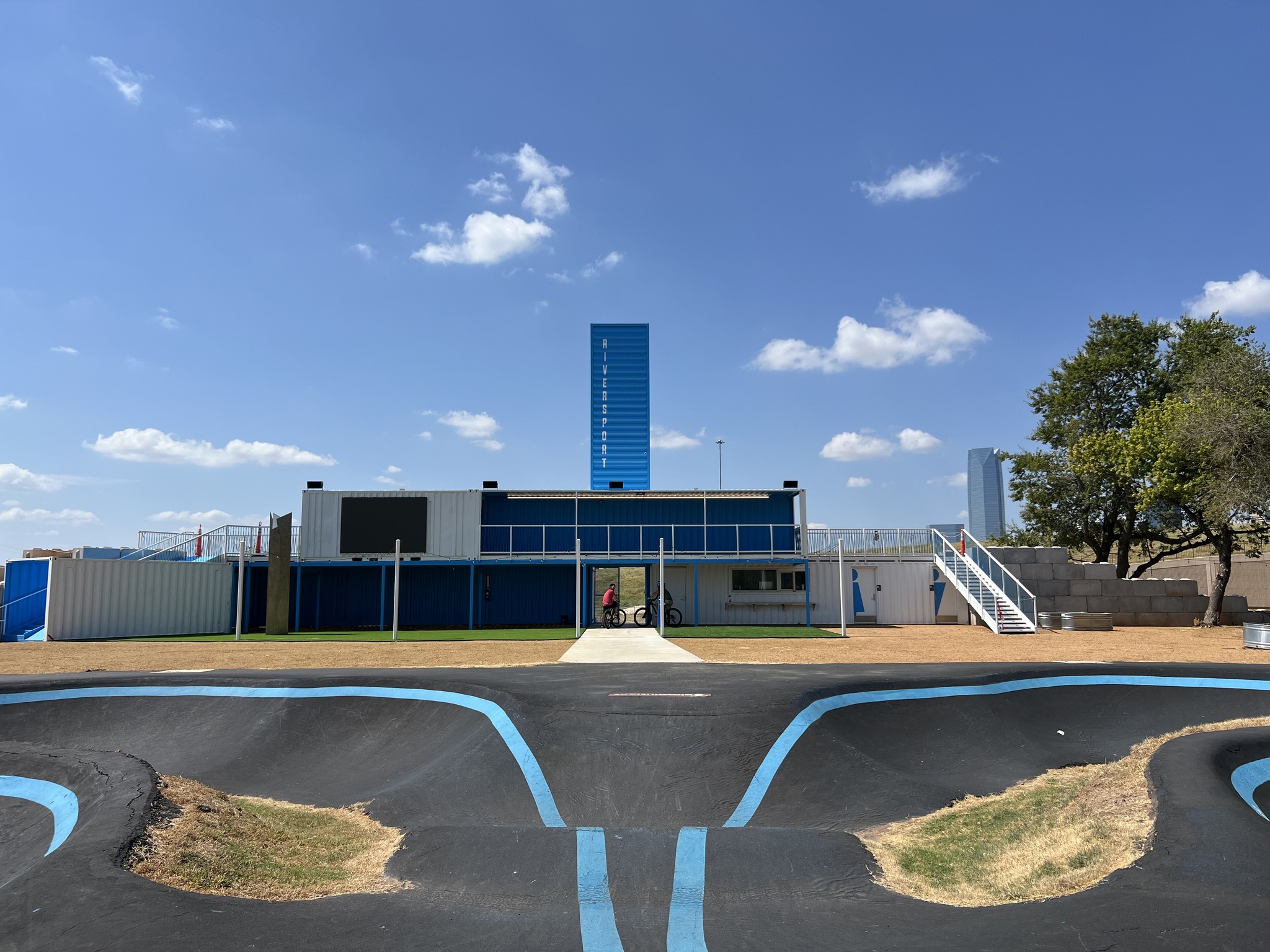 The expanded Trailhead Bike Park includes new and revamped trails, a Thunder OKC branded trail feature, the Wheelhouse coffee stop, and a unique elevated trail running across the rooftop of the park’s repurposed shipping containers.