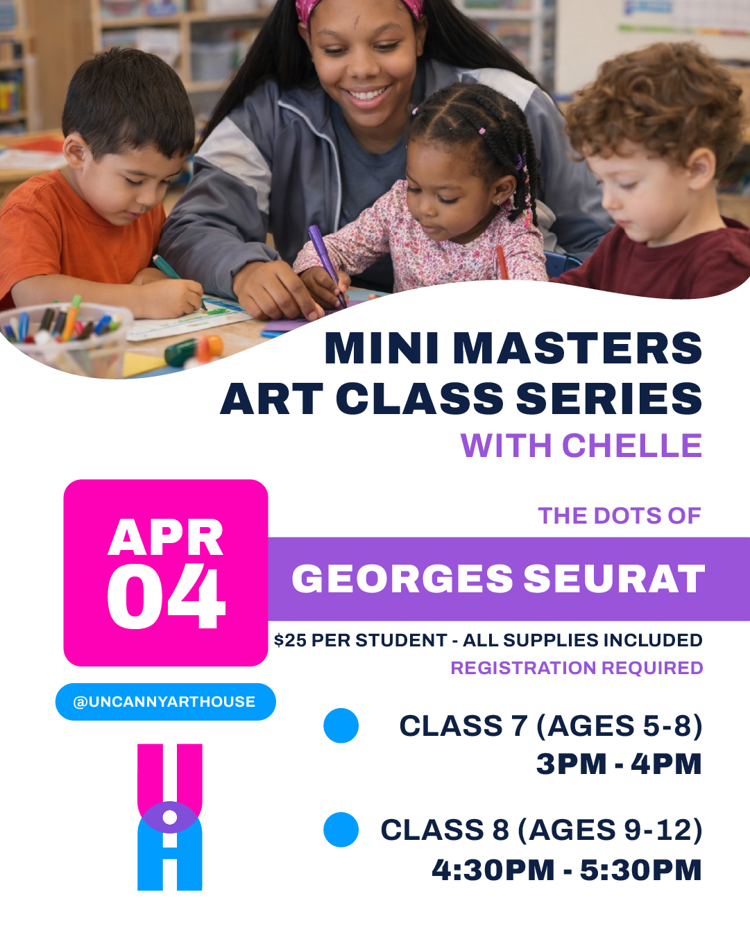 This class introduces young artists to pointillism through the work of Georges Seurat. Using dots, patterns, and bright color combinations, students will explore how small marks work together to build images. Through playful, hands-on projects, participants will experiment with repetition and simple color relationships while developing focus, fine motor skills, and creative confidence.