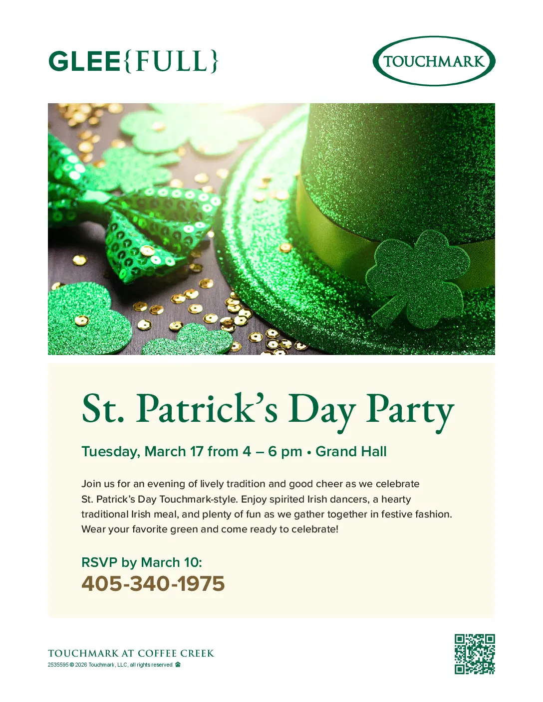Join us for an evening of lively tradition and good cheer as we celebrate St. Patrick’s Day Touchmark-style. Enjoy spirited Irish dancers, a hearty traditional Irish meal, and plenty of fun as we gather together in festive fashion.
