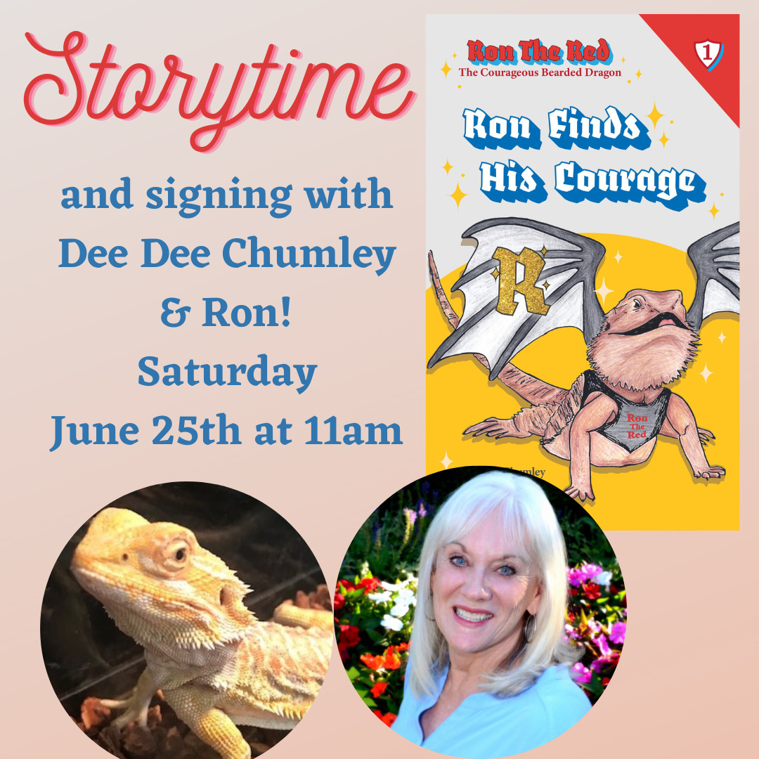 Features author Dee Dee Chumley and bearded dragon Ron for a special storytime, reading Ron Finds His Courage. Dee Dee will also sign books.