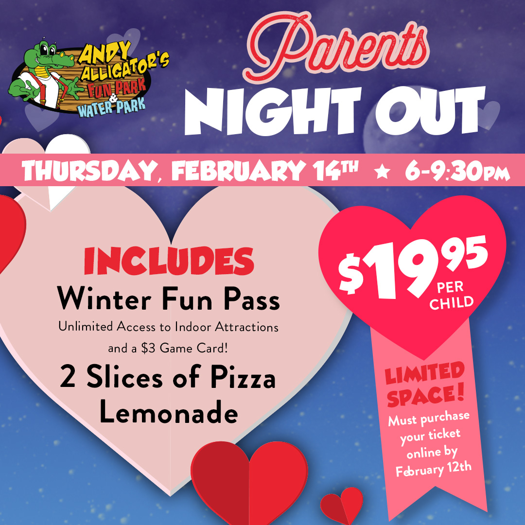 Enjoy Valentine's Day kids-free this year with Andy Alligator's Parent's Night Out.