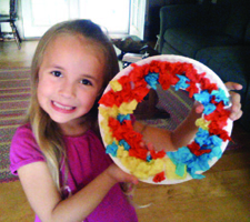 Show your child how to fold a paper plate in half and encourage her to cut a semi-circle around the inside of the plate. Remove the inside of the plate after it is cut, then unfold the plate to reveal a wreath. Help your child decorate the wreath by tearing small pieces of tissue paper and squeezing the paper into balls. Give her a glue stick to use to cover the wreath in glue, or dip each paper ball into glue and attach to the plate. To finish, help your child punch two holes at the top of the wreath and lace ribbon or yarn through the holes so she can hang her creation.