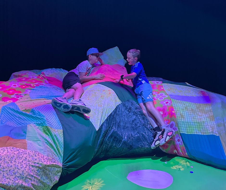 The first thing we noticed were textures everywhere. From vibrant quilts and plush pillows to handmade cushions and a GIANT squishy fabric-and-foam blob (yes, that’s the technical term), the entire space begs to be touched. My kids, of course, were thrilled — and dove right in.