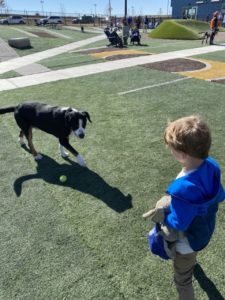 Even if you don’t have a furry friend in tow, you are still welcome at Bar K. Unfortunately our precious pup passed away recently, and we are thinking about what kind of dog might be a good fit for our family with two young kids. This actually made visiting Bar K the perfect activity, because we were able to watch dogs of all kinds interact with our kids, with other people and with other dogs too. We could watch their energy levels, friendliness and playfulness. The whole 2-acre park is professionally staffed, so if any dogs got too rowdy or approached our kids in a rough way, the attendants pulled the dogs away.