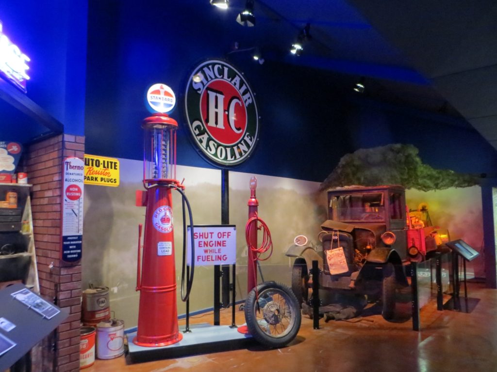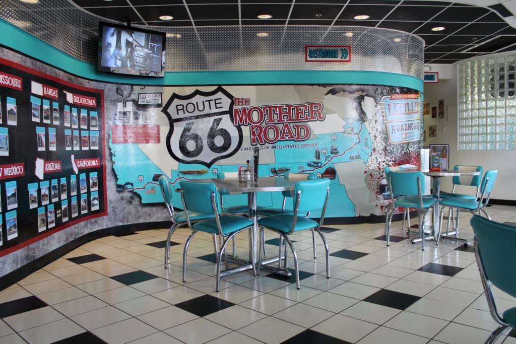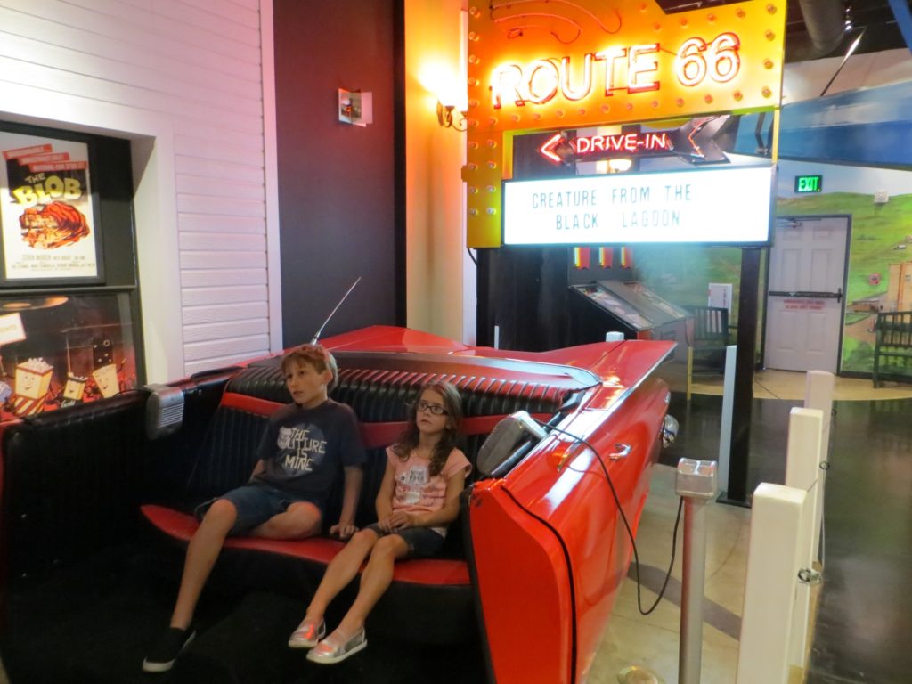 The Route 66 Museum in Clinton tells the story of the Mother Road through a variety of formats. The museum is divided into areas representing different decades and showing how Route 66 changed over those years, from its days as a dirt road to its major role in American history and beyond. It also shares the stories of the people who made Route 66 famous and who still work today to preserve the legacy of this great piece of history. Visitors are immersed in sights and sounds of the time with photos, videos and music, as well as expertly crafted displays of roadside attractions. There are plenty of chances for children to touch and pick up items, so don’t worry about your younger ones being bored! My 10-year-old son thoroughly enjoyed the Oregon Trail-type game where he was a traveler on Route 66 trying to make it to California with the few dollars he had from selling off his household items. My 5-year-old daughter loved the music that accompanied each section.