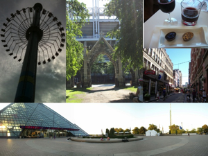 Above, at right—From top left: Looking up at the MaxAir thrill ride at Cedar Point; something old and something new along a bike tour of the city; pairing wine and craft beer with chocolate at Lilly; Fourth Street as seen from a bike tour; the Rock and Roll Hall of Fame in panorama.