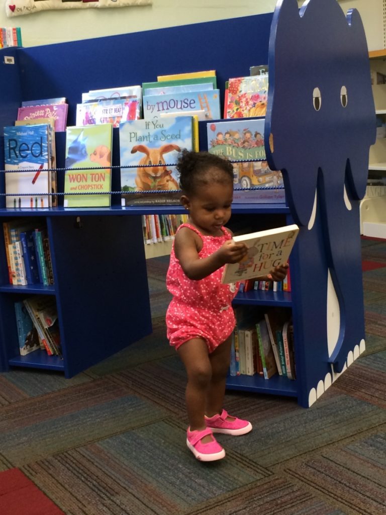 And as if Parker was already prepared to start, she marched back and forth from the couch I was sitting on to the blue elephant bookshelf, bringing me several titles to read. It was as if she were saying, “Mom, did you see this one? What about this other one?” My little reader is such a girl after my own heart. It was a cute game to her and I couldn’t even keep up with all the books she was handing me. Tea Time. Time for a Hug. Humpty Dumpty. Spot’s ABC’s. And my personal favorite, Spot Goes Shopping. There were more, but I picked five. I read them to her and a curious boy, named Isaiah, wandered over, proving how awesome my ROL skills are. Register for the library’s summer reading program and complete 20 minutes of reading? Done and done!