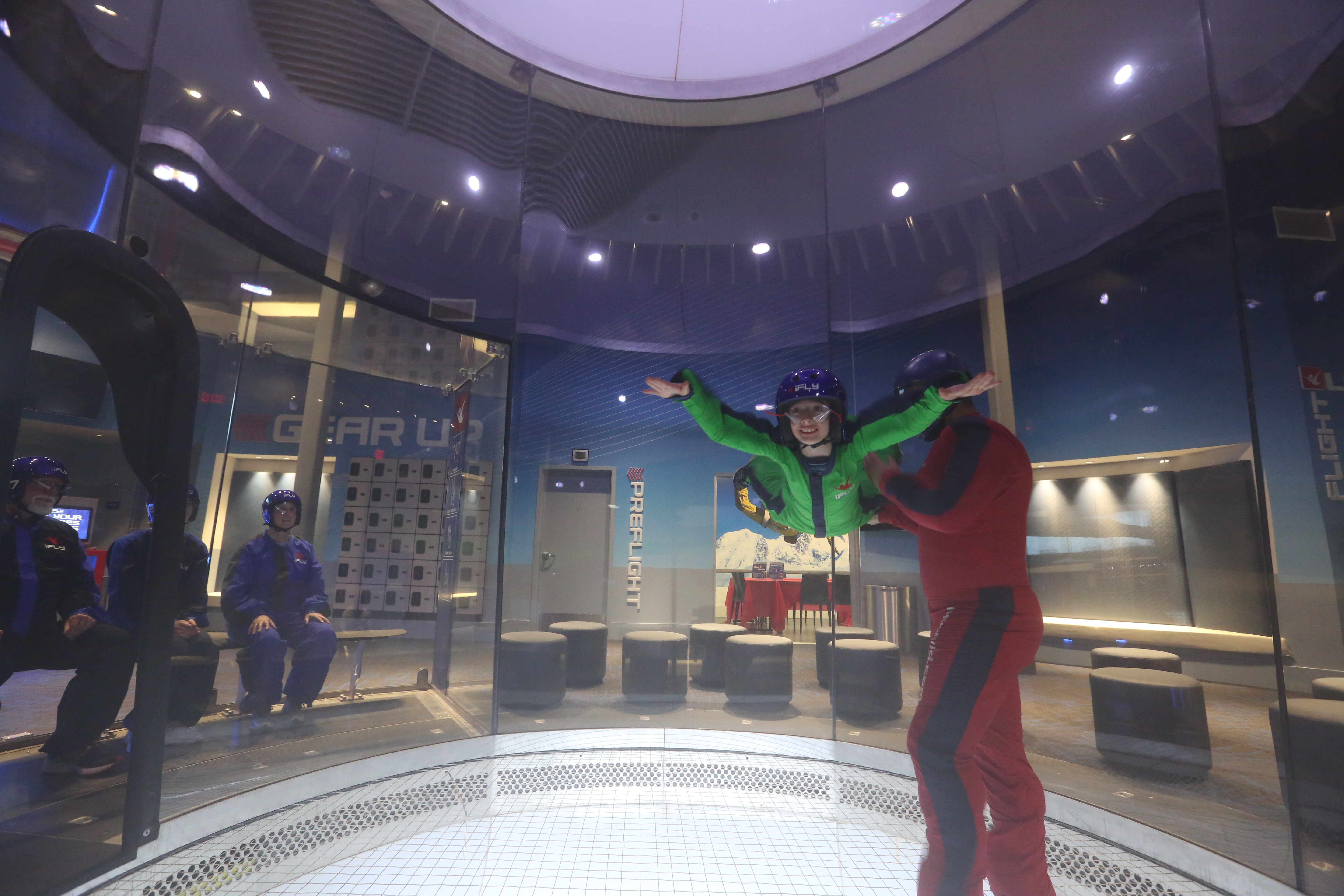 The way iFLY works is with incredibly powerful fans in a vertical wind tunnel. It simulates freefall skydiving but the activity is actually flying instead of falling, with the ability to fly upward into the tunnel.