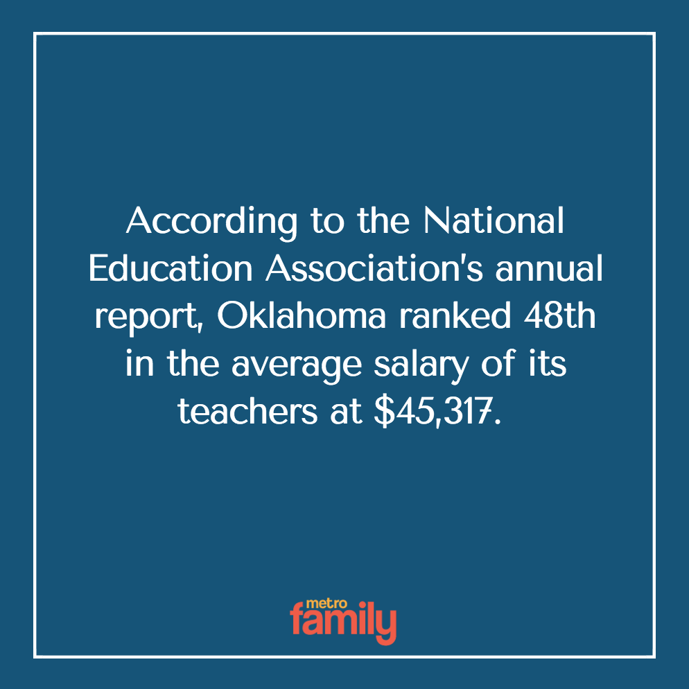 According to the National Education Association’s annual report, Oklahoma ranked 48th in the average salary of its teachers at $45,317. The national average is $12,000 more. Oklahoma teachers wouldn’t have to travel far to make more money. In fact, any of the surrounding states would likely offer more pay. The average teacher salary in Texas is $50,017, Colorado is $49,828 and Kansas is $48,990.