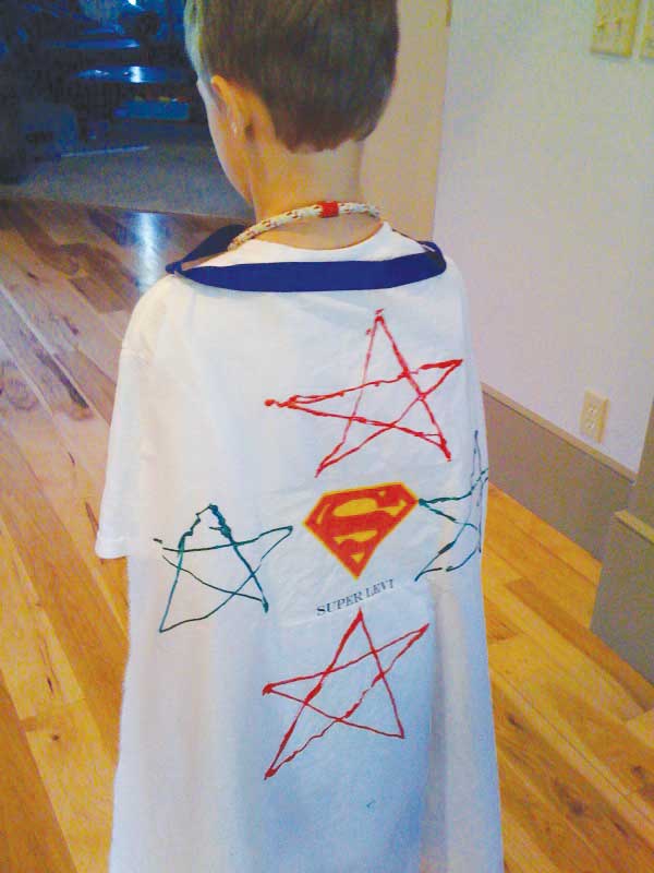During the party, I let the kids decorate their capes with fabric markers and paint pens, using cardboard underneath to protect my surfaces. ~ Stacey S.