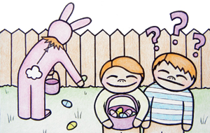 I admit it: I can’t wait until the Easter Bunny stops hopping by our house. It’s not that I don’t like holidays; I just can’t take the pressure of being the responsible adult. The trouble with children is that you can’t put much over on them, especially when they seem to be on the elementary school track for pre-pre-law.