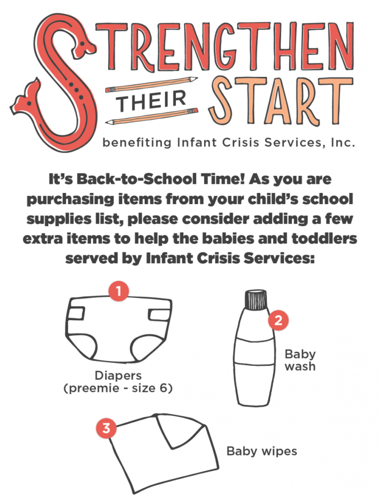 We’re partnering with Infant Crisis Services to host a drive through Sept. 7 called Strengthen Their Start. As you go back-to-school shopping, pick up diapers, wipes and baby wash and drop them off at ICS (4224 N. Lincoln Blvd.) or any of the drop-off locations listed at www.infantcrisis.org and below: