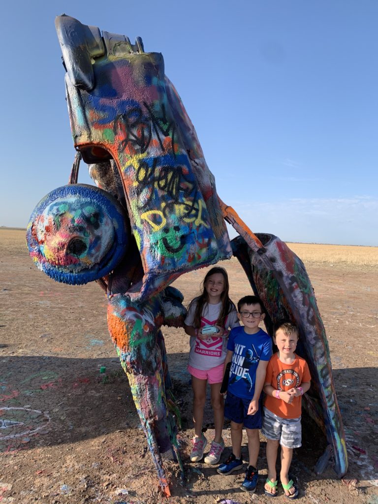 It’s a long drive to Colorado, y’all — about 11.5 hours from Oklahoma City to Bayfield. In addition to packing plenty of activities, books and car snacks, we planned stops with interesting sights and opportunities to stretch our legs along the way. Don’t miss Cadillac Ranch in Amarillo, Texas, where the hulls of old cars are sunk into the ground and are constantly being spray painted by amateurs and artists alike.