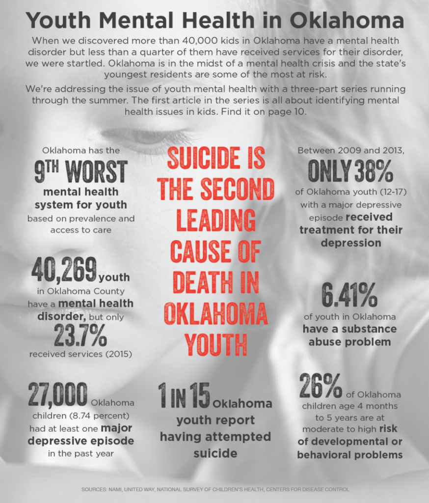 Perhaps most frightening, suicide is the second-leading cause of death in Oklahoma for youth ages 10 to 24, with one in 15 Oklahoma youth reporting attempted suicide. That’s as many as two students in an average middle school classroom. Nationally, 90 percent of youth who committed suicide had an underlying mental health condition.