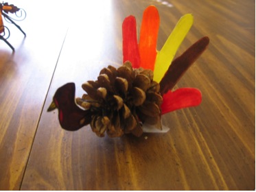 - Now we need to make a head for the turkey (see photo at right). Make it in the shape of an S so it will look turkey-like when it is attached to the pinecone. Color it (front and back) and cut it out.